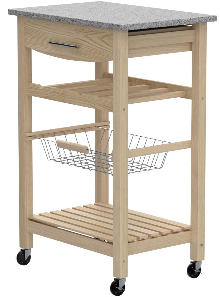 Expand your kitchen workspace with this natural finish work island featuring an elegant granite top. The cart is complete with chrome finished hardware, a slide out wire storage basket, one fixed shelf, 4 bottle wine storage rack, a spacious pull out storage drawer, and heavy duty locking rubber casters for easy mobility and safety.
