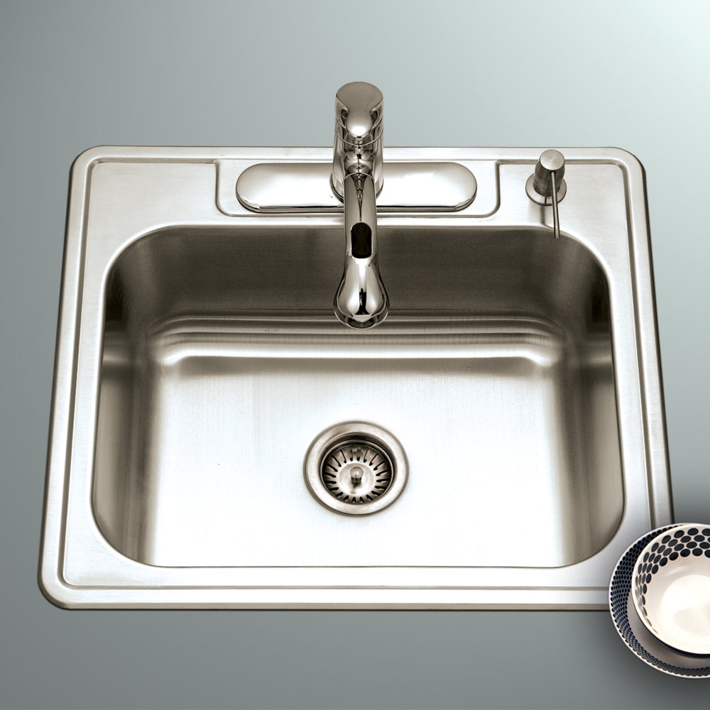 Topmount Stainless Steel 4-hole Single Bowl Kitchen Sink, 9-Inch Deep Model# 2522-9BS4-1 Write a Review Features & Benefits Compatible with the following accessories: BG-2500, CB-2500, RB-2500 Bowl measures 21-inches by 15.75-inches by 9-inches deep Features a lustrous satin finish and a sound absorbing pad Made with T304 premium stainless steel