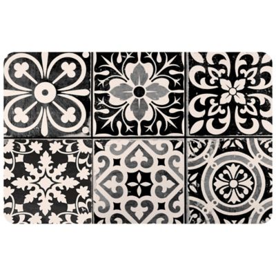Mat measures 36L x 24W x 0.25H in. Crafted of vinyl. Ornate tile design. Hues of black and white. Protects floor from scratches, spills, and abrasions. BPA and phthalate free material is safe to use anywhere. Designed to lay flat on hard surface floors; not recommended for use on carpet. Unrolls flat for immediate usage.