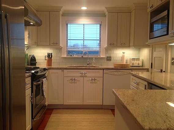 Coastal kitchen features a cooking corner which boasts a white kitchen hood over a frosted glass cooktop backsplash and induction cooktop over convection oven next to wall mounted stainless steel utensils' rack beside doorway to pantry finished with pocket door. Coastal Style