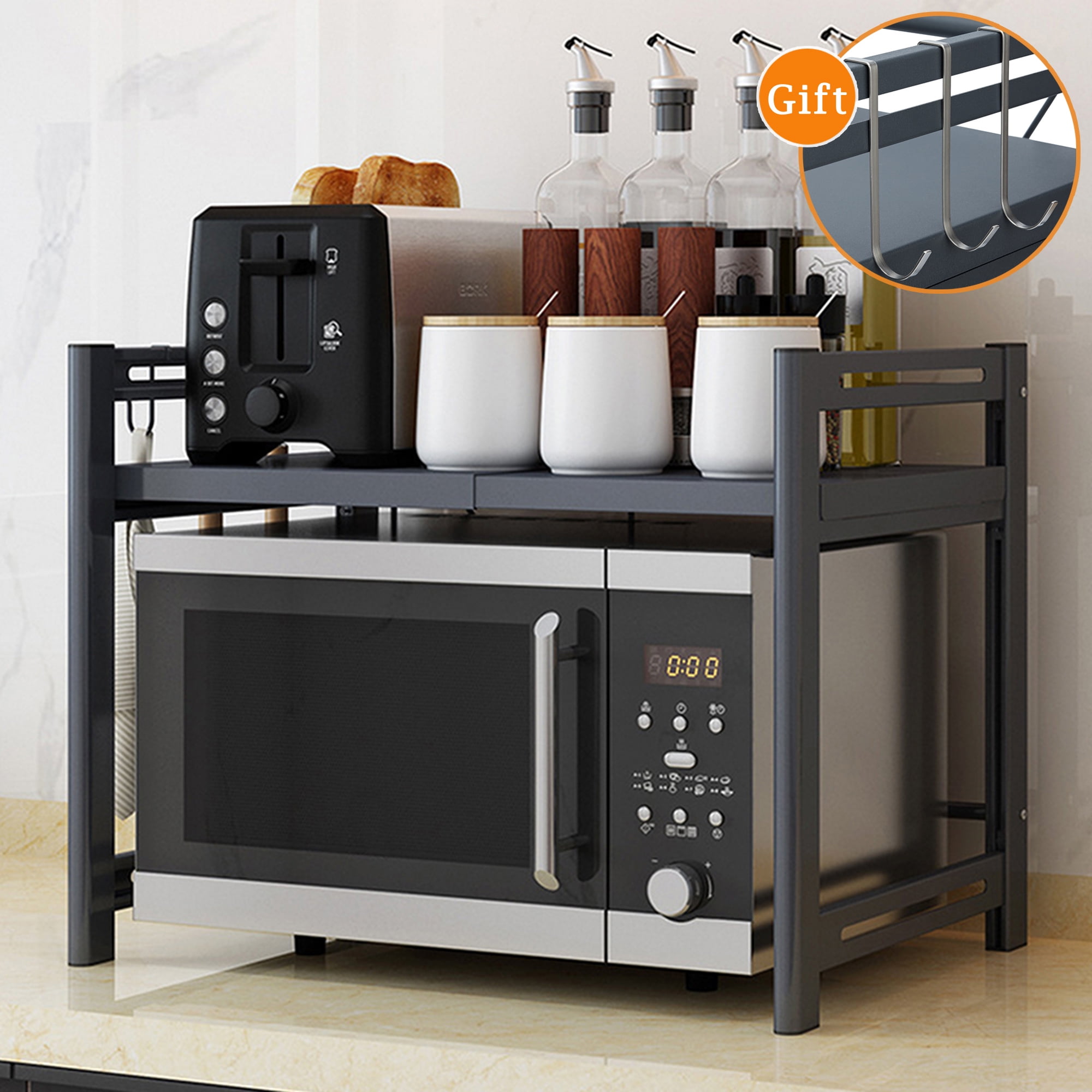Costway Industrial Kitchen Baker's Rack Microwave Stand Utility Home Shelf w/ 6 Hooks. Costway. $113.99. reg $209.99. Sale. Sold and shipped by Costway. a Target Plus™ partner. Free standard shipping. Choose options. Durable and stable: the microwave oven can hold up to 50 kg. There are four non-slip Foot pad on the bottom to help secure the shelf to prevent slipping and scratching of the table. Easy to install: the microwave oven is very easy to install. Old DIrd Microwave Oven Rack, Expandable Carbon Steel Microwave Shelf,2-Tier Adjustable Kitchen Counter Shelf and Organizer with 3 Hooks,110lbs Weight Capacity,Black H Type 4.4 out of 5 stars 26 $35.99 $ 35 . 99 $37.99 $37.99 Create more space with the organize it all countertop microwave stand. Designed to fit over your microwave to create a storage shelf above. The microwave stand is freestanding and contains 1-shelf and side hooks for hanging storage. The feet of the stand have rubber stoppers that keep the stand in place and protect your countertops from scratches.