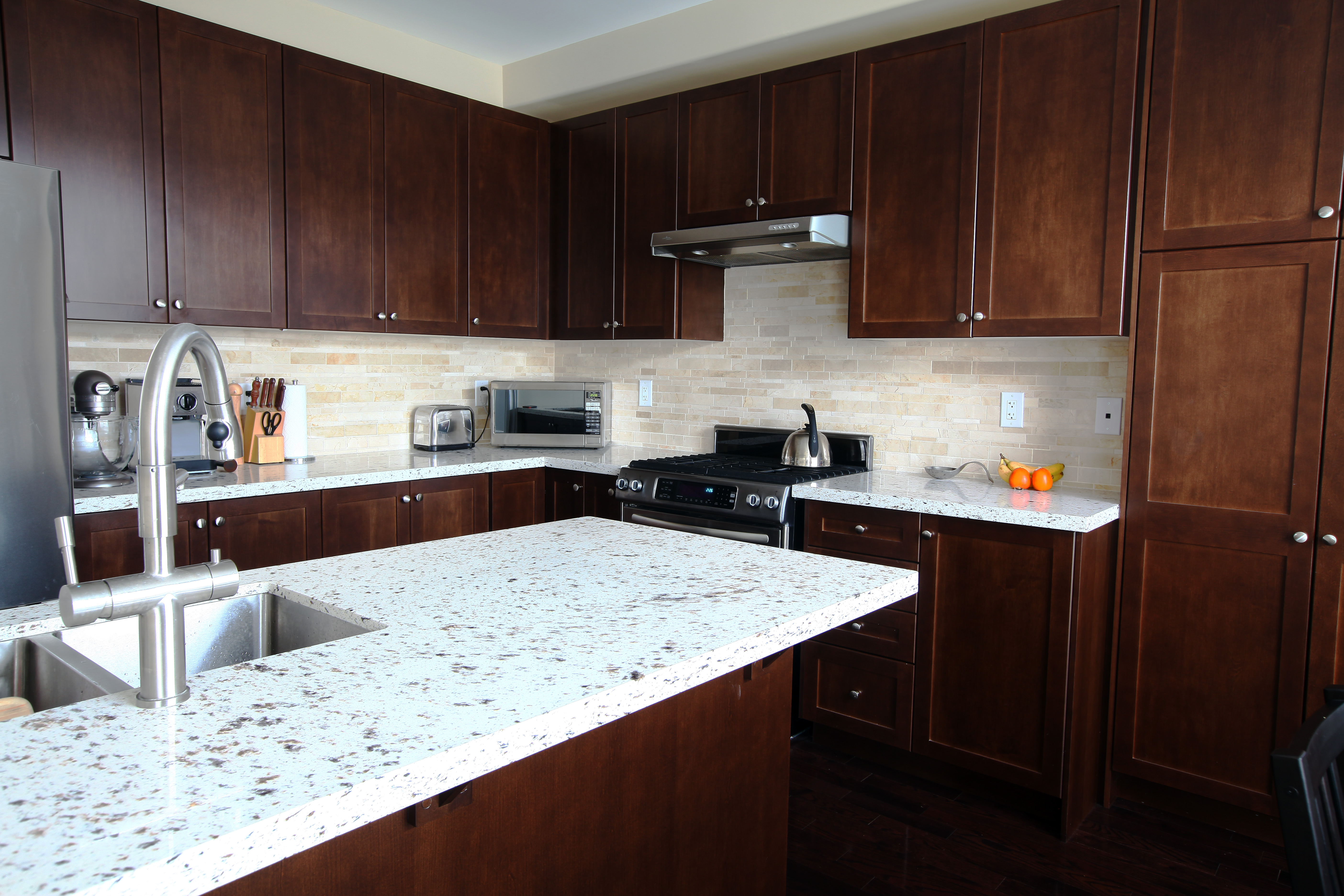 Helpful Resource: 22 Pros & Cons of Granite Countertops Quartz countertops can be customized to go with any cabinet material, cabinet color, backsplash, and flooring. In addition to traditional stone-like designs, solid-colored countertops like the one in the picture below are becoming extremely popular, especially in modern homes.