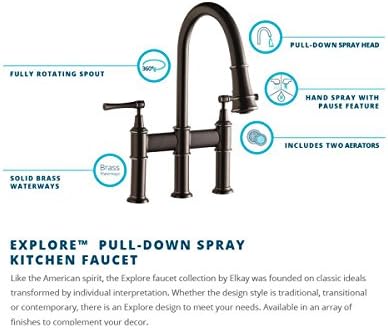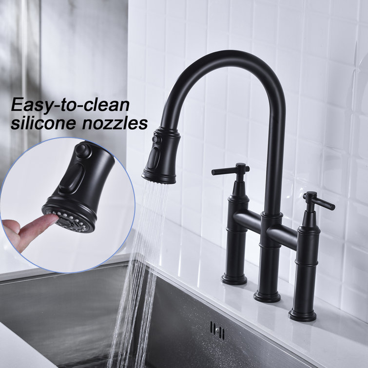 Double Handle Bridge Kitchen Faucet with Pull Down Spray Head in Brushed Nickel Striking the perfect balance between classic Striking the perfect balance between classic and contemporary style, the graceful curves and decorative details of the Allyn bridge faucet create a transitional look that complements any kitchen. Designed for ultimate convenience, the 3-function pull-down spray head ... Make sure this fits by entering your model number. MODERN DESIGN--RKF kitchen faucet design make your kitchen room simple and fresh,easy to match every sink.Unique industrial aesthetic appearance, let you have a sense of belonging in the kitchen. GREAT VALUE FOR MONEY--Commercial kitchen pull down faucet come with FREE soap dispenser, high quality ceramic CUPC cartridge has passed 500,000 ... Double Handle Bridge Kitchen Faucet with Pull-Down Spray head in Spot in Brushed Nickel This bridge kitchen faucet makes your kitchen This bridge kitchen faucet makes your kitchen room simple and fresh.corrosion-resistant finish will not fade or tarnish over time.Steel that resists water spots and fingerprints - SOLID BRASS CONSTRUCTION and top of the line components ensure long-lasting leak ...
