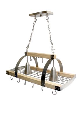 Acuna 2 Light Kitchen Hanging Pot Rack. Update your kitchen in style with this industrial styled two light pot rack fixture featuring a natural wood finish. An elegant functional lighting design. The fixture is enhanced with hooks to display fine cookware for easy access in kitchens. Kitchen pot racks offer efficiency and ease of access and storage. They are the smartest solution to save counter and cabin space in a stylish way. Moreover, hanging kitchen pot racks offer the opportunity of adding light fixtures to the actual rack. Enclume "Rack It Up" Pot Racks are affordable and are available in various shapes and sizes. Featuring super-strong new technology Drywall, these pot racks will hold hundreds of pounds while remaining light enough for easy installation. The pot racks make the ideal focal point in any kitchen...