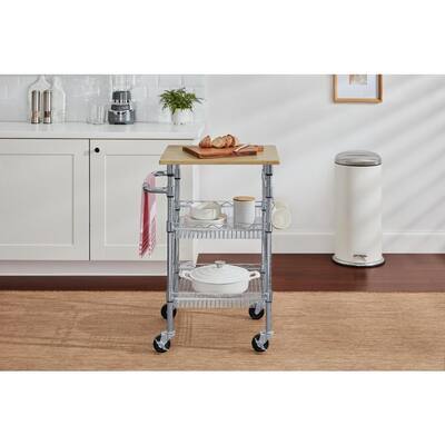 Chrome-plated steel kitchen cart with caster wheels and removable wood top; ideal for a microwave,... 1.5 inch wood top shelf with 2 adjustable chrome shelves; ...