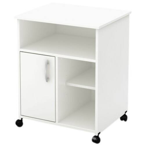 Kavanaugh Microwave Kitchen Cart with four castor wheels with three open spaces, one white drawer, and a large storage space closed with two white doors. Number of Interior Shelves: 1. Overall: 54'' H x 52'' H x 25'' W x 16'' D. Adult Assembly Required: Yes.