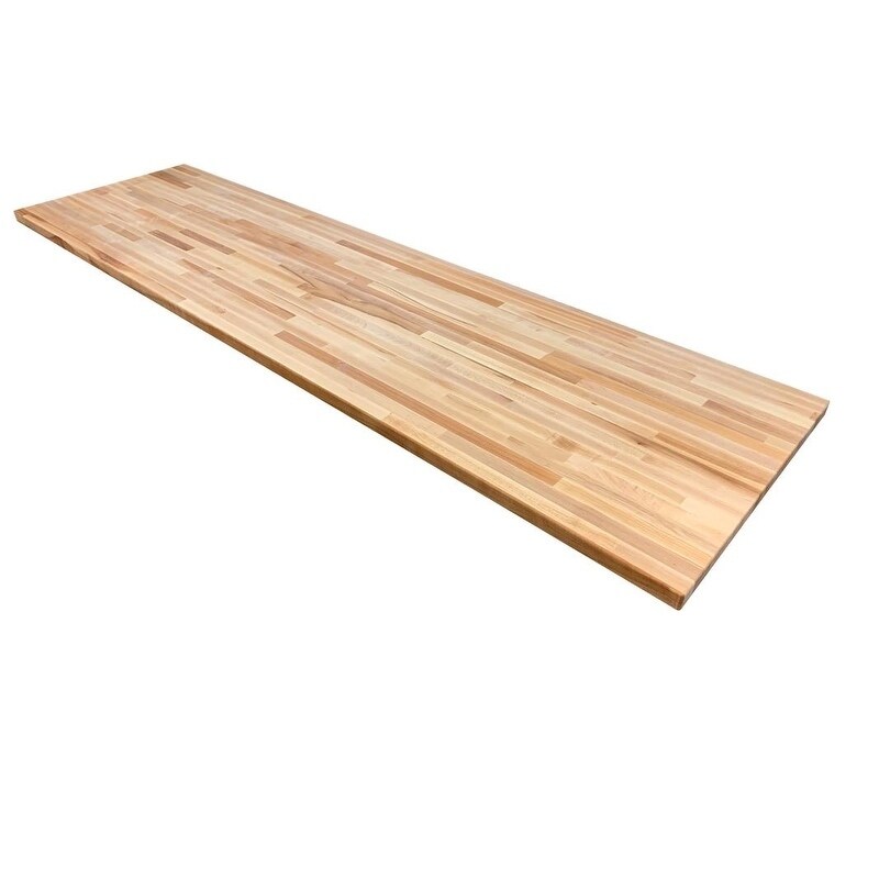 Sparrow Peak Maple 120-in x 25-in x 1.75-in Unfinished ... Solid wood butcher block can easily be cut, stained, lacquered and finished Natural Maple Dimensions are 1-3/4-in thick x 120-in long x 25-in deep (44mm thick x 3048mm long x 635mm deep), and weighs approximately 150 pounds Harvested from sustainable forests