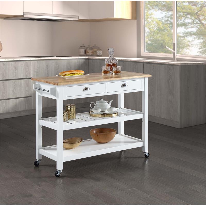 Rubberwood Butcher Block Kitchen Cart | Ashley Furniture ... Add cut-above form and function with this two-tone kitchen cart. Its sleek, modern aesthetic features a solid wood butcher block top and white frame, as well as two open shelves for your pots, pans and small appliances. A pair of swivel casters and a side handle/towel rack let you conveniently move the cart wherever you need it most. Made of wood