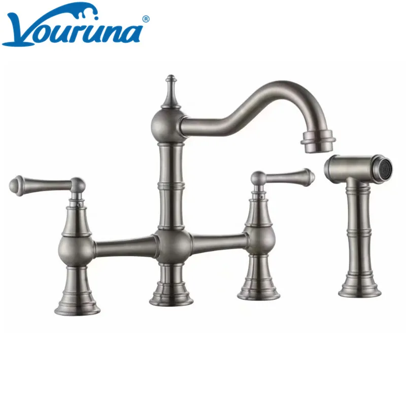 The Best Bridge Kitchen Faucets With A Sprayer — TruBuild ... Bridge Kitchen Faucets With A Side Sprayer -. This type of bridge faucet has a sprayer that is separate from the faucet and instead sits next to the faucet in the sink deck. It is a more classic style of faucet that will need an additional hole in the countertop or sink deck.