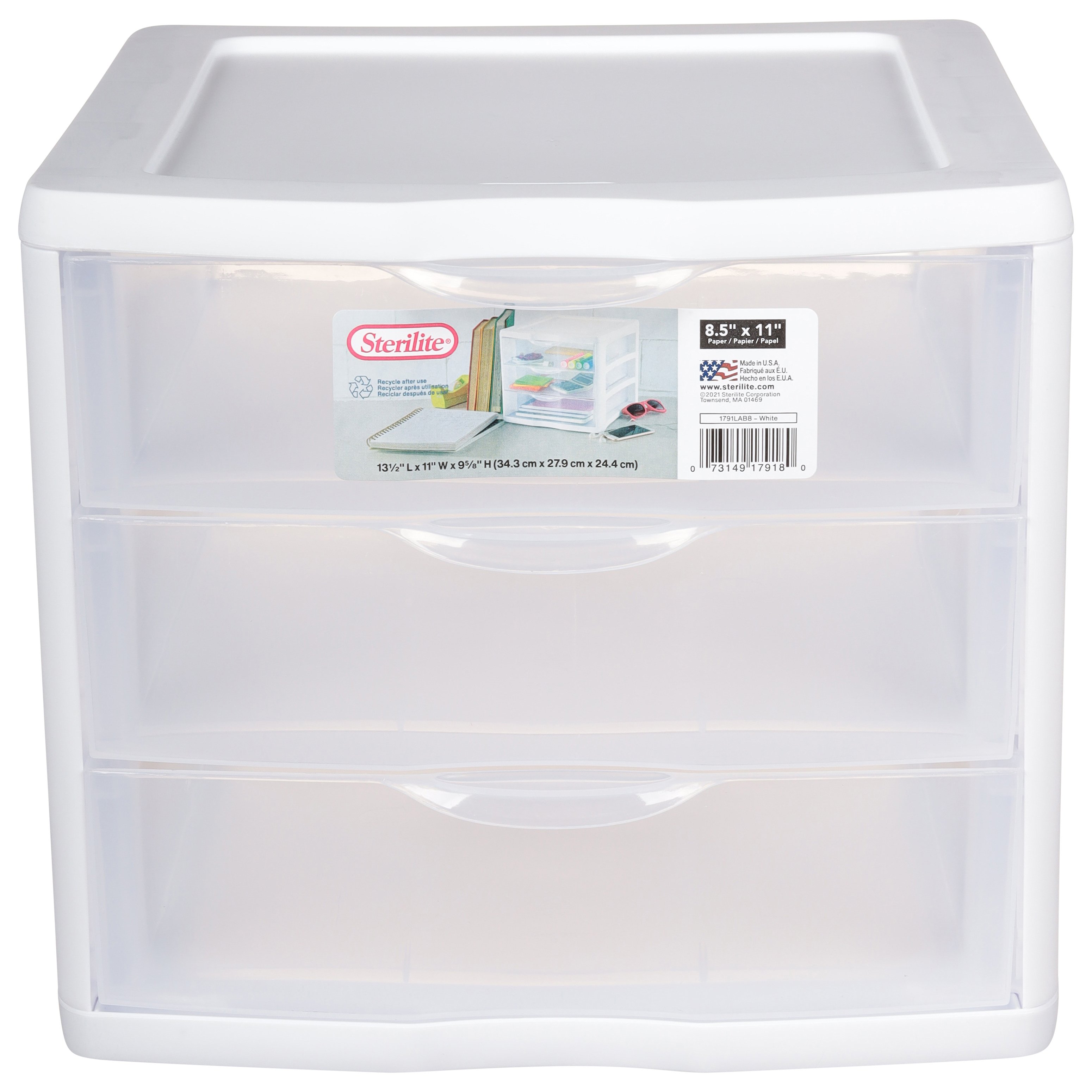 Sterilite White 3-Drawer Organizer | Big Lots Model number: 17918004. 13.5"L x 11"W x 9.63"H. Material: plastic. Features. Contemporary design with white case. Includes 3 - clear drawers for easy identificiation of contents. Drawers can accommodate a standard ram of 8.5" x 11" paper. Ergonomic drawer handles are easy to pull and push.