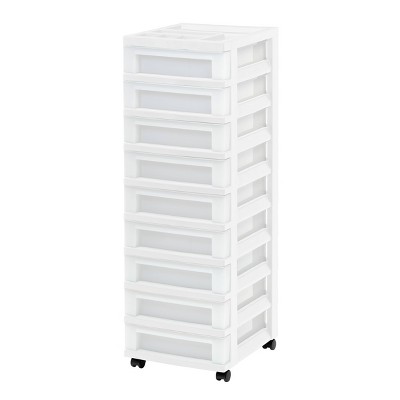 IRIS White 5-Drawer Storage Cart With Organizer Top Each drawer accommodates 8.5" x 11" letter size paper and the built-in divided organizer top keeps extra-small items organized and accessible. Excellent storage and organizational solution for offices, hobby rooms, dorm rooms, and more. Details: White. 14.25" x 12.05" x 22.25". 5 drawers. Built-in organizer top.