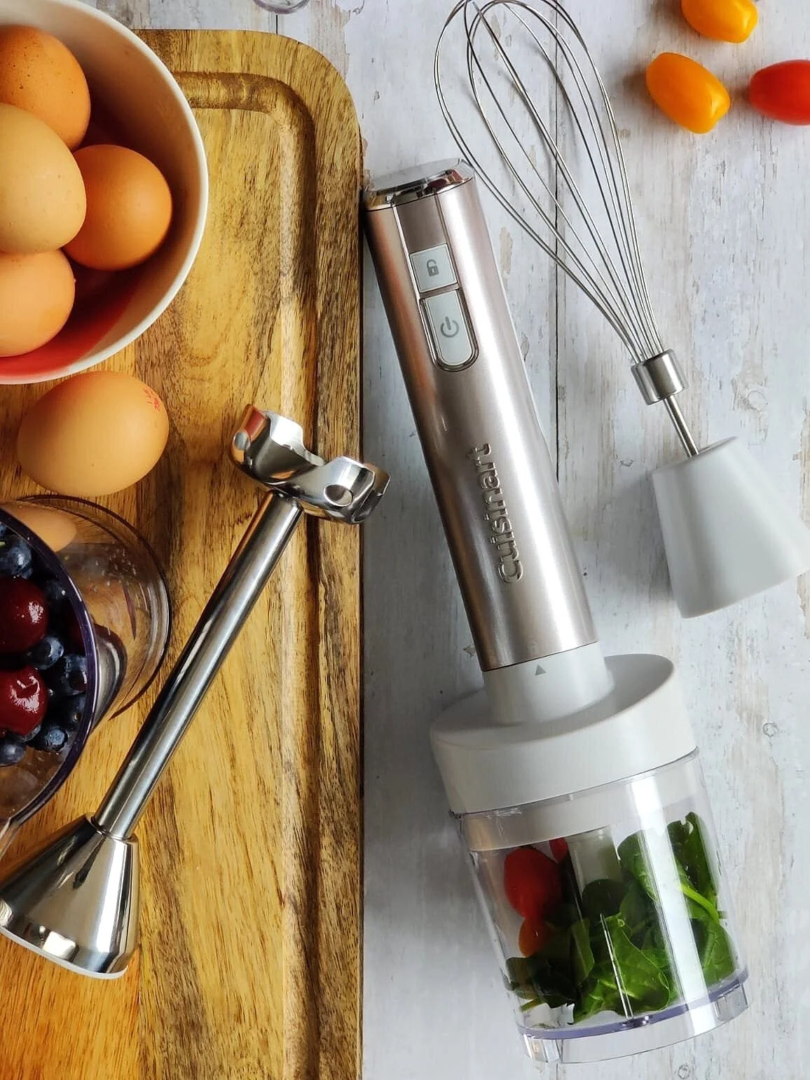 Cuisinart EvolutionX Cordless Rechargeable Hand Blender ... Mar 08, 2022 · Summary. This cordless hand blender from Cuisinart packs the power of a countertop model into a sleek and compact design. It purées soups and sauces with ease and whips cream in seconds, it comes with a 30 oz. beaker, perfect for blending smoothies, salad dressings and more. 8 1/4" stainless-steel shaft reaches into pots and bowls.