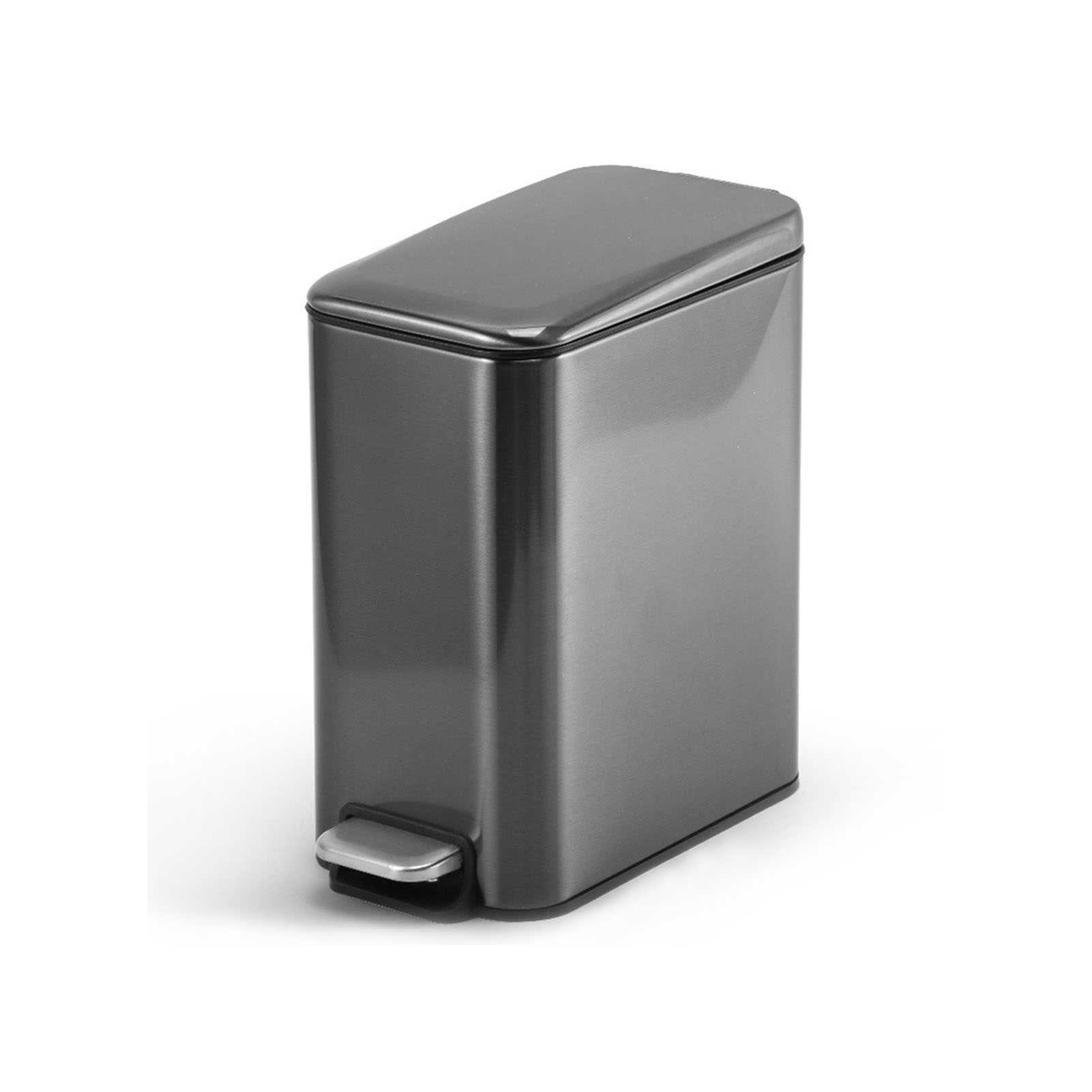 simplehuman 10-Liter Brushed Stainless Steel Slim Profile ... 10-Liter Fingerprint-Proof Brushed Stainless Steel Slim Profile Step-On Trash Can The simplehuman profile step can has a slim The simplehuman profile step can has a slim profile shape that makes it a great fit in a bathroom or under a desk. It has a durable steel pedal that is designed to last, and patented lid shox technology ensures a smooth, silent close every time.