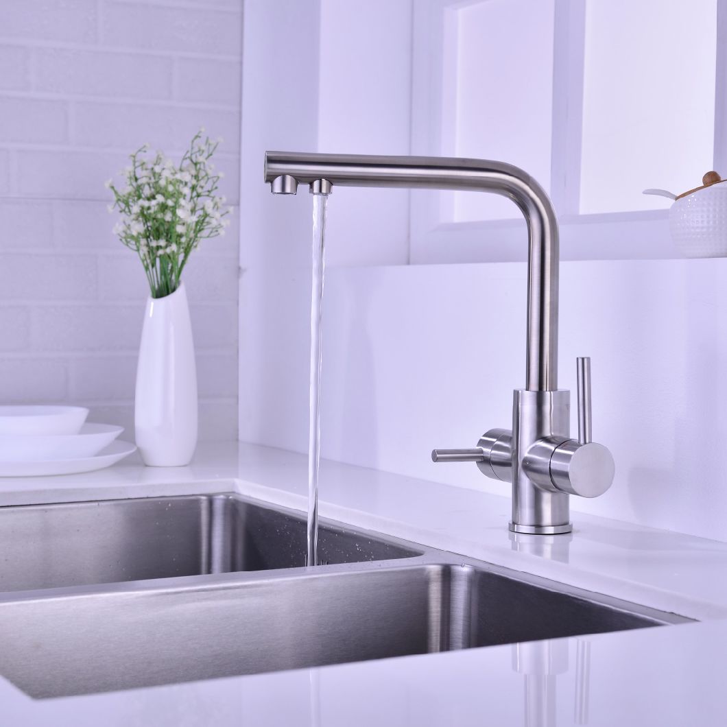 Built-in Water Filter - Kitchen Faucets - The Home Depot Number of Faucet Handles Single Handle (3) Double Handle (1) Involve View Series Instant Hot & Cold Water Dispenser Tank with Filtration System & 2-Handle 6.75 in. Faucet in Chrome byInSinkErator (1) $58900 Involve Wave Series Instant Hot Water Dispenser Tank with Filtration System & 1-Handle 6.75 in. Faucet in Satin Nickel byInSinkErator $55400