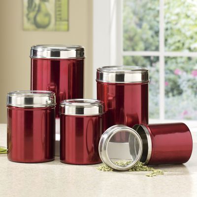 Stainless Steel Canister Set for Kitchen Counter with Glass Window ... HIGH QUALITY SAFETY MATERIAL: This airtight canister set is made of high quality red stainless steel and lead-free glass. The set features narrow uniform glass cylinders encased in stainless steel. These slender modern canisters look great lined up on your counter top or grouped together for saving space, conveniently storing your dry pantry goods.