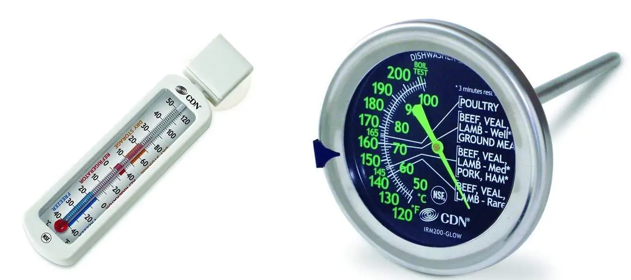 CDN IRM200-Glow ProAccurate Thermomètre pour viande/volaille Certifié ... CDN's ProAccurate Meat/Poultry Ovenproof Thermometer (IRM200) features an extra-large 2-inch (5.1 cm) dial with a durable laboratory glass lens and a 5-inch (12.7 cm) stainless steel stem. It is waterproof and features a handy temperature guide and target range indication to take the guesswork out of roasting.