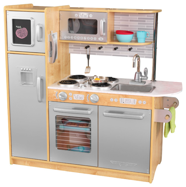 KidKraft Uptown Natural Play Kitchen with 1 Piece Accessory Play Set ... Our KidKraft Uptown Natural Play Kitchen for kids has a hip, modern look that young chefs are sure to love. With tile-look backsplash and sleek countertops, the design is emulated from trendy real-life kitchens. Every appliance is interactive, including doors that open and close, knobs that turn and click and a working chalkboard on the freezer ...