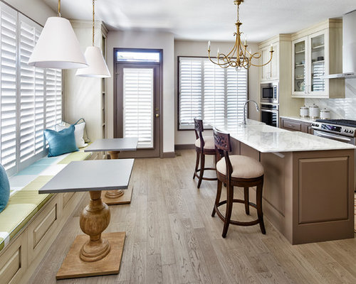 Small Nook Kitchen Banquette - Photos & Ideas | Houzz Space saving solutions started with the design of a banquet in the kitchen. The banquet's focal point is the two stained glass windows on either end that help to capture daylight from the adjoining spaces. Material selections for the kitchen were driven by the desire for a bright, casual and uncomplicated look.