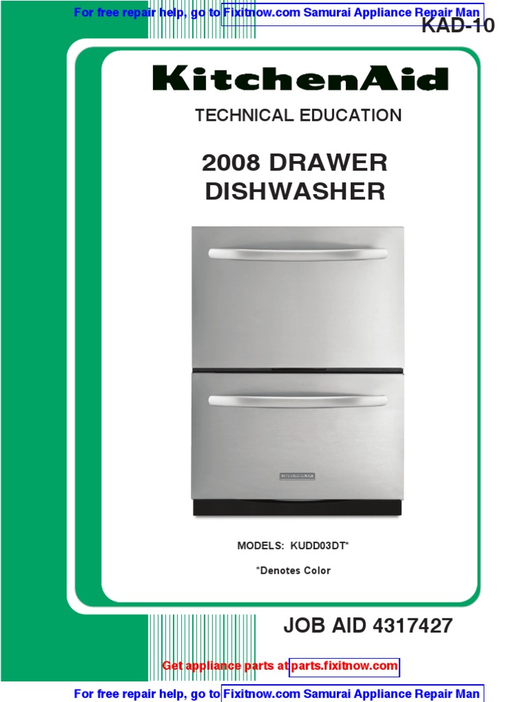 KUDD03DTSS Kitchenaid Kitchenaid Double-Drawer Dishwasher System Whisper Quiet (R) Sound Insulation System 6 Cycles 4 Cycle Options Architect (R) Series II with 6 Wash Cycles w/ 4 Options , Pro Wash™ & Pro Dry™ Features , Energy Star® , Sani-Rinse ™ Option , Whisper Quiet® Sound Insulation. This item is no longer available online. Please call us at 888-487 ... Kitchenaid Double Drawer Dishwasher Troubleshooting This kitchenaid job aid double drawer dishwasher (part no. Common complaints are covered, such as wash quality problems (spotting, filming, etching, etc.), leaking, water not filling, water level and draining problems, pump rebuilding, motor, timer, heater and other electrical problems, drying troubles and other kitchenaid dishwasher problems.
